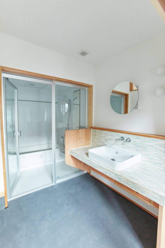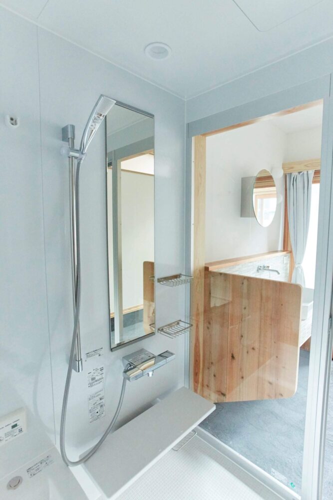外温水シャワーで砂を落としてウエットのままバスルームに直行!!